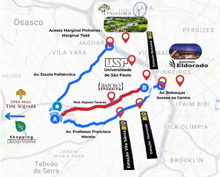 📍 Pinheiros em 20 min: “Acesso direto pela Politécnica, evitando o gargalo da Raposo Tavares.”